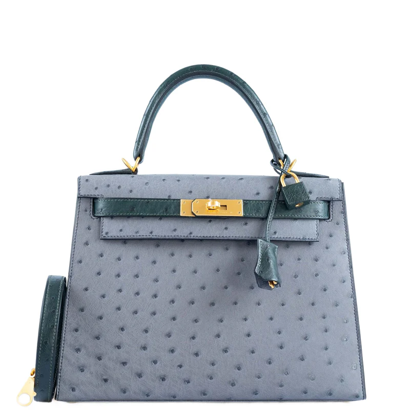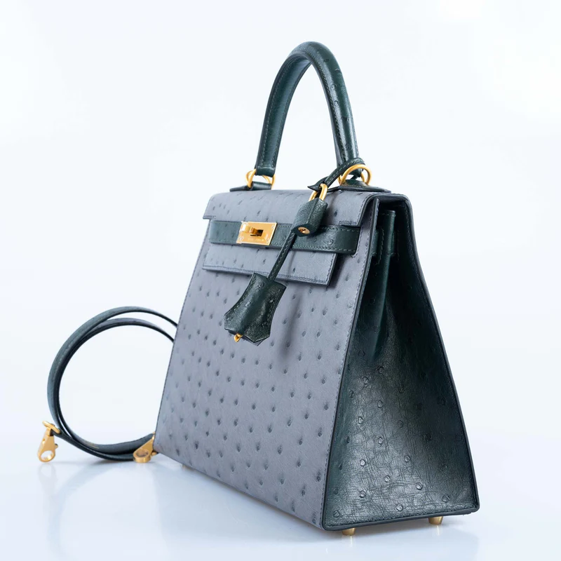 Elevate your style with the luxurious Hermès Kelly 28 HSS Ostrich Bag in Gris Agate and Vert Titien colors, adorned with exquisite gold hardware. Crafted with precision and unparalleled artistry, this iconic handbag is a true statement piece for the fashion-forward individual. The blend of rich ostrich leather and vibrant hues creates a stunning visual appeal that is bound to turn heads wherever you go.